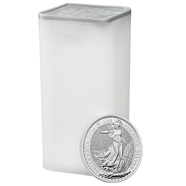 All 2026 1 oz British Silver Britannia Coins are available in Brilliant Uncirculated condition. These coins are shipped individually in protective flips, with multiples of 25 packaged in acrylic tubes and multiples of 500 coins in Monster Boxes. Each box holds 20 tubes of 25 coins each.